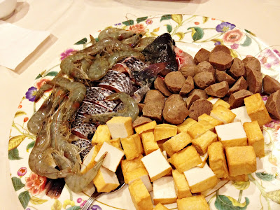 海鮮跟火鍋料盤送上桌時更是驚人,整隻鮮魚切塊,加上鮮蝦及大份量的火鍋料,讓人等不及要把食材一一丟入鍋中來享用了。