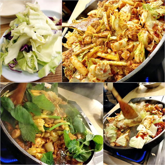雞肉差不多入味熟透時,就會加入青菜一起拌炒,在韓國當地,加入熱狗和起司也是相當流行的吃法,在這裡可以選擇額外加入起司。年糕炒到入味之後彈牙味美,雞肉本身也很嫩,這時候如果有一碗白飯來搭配也不賴。