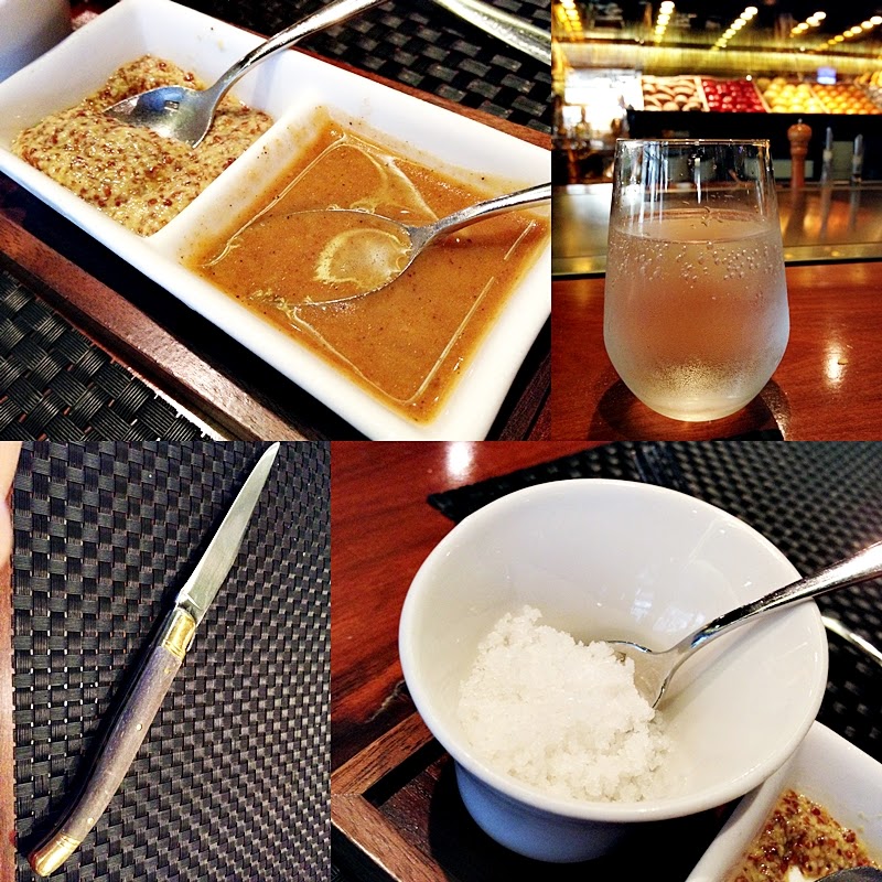 搭配牛排的醬料,包括左邊經常在高級牛排館中可以點用、包括芥末子的芥末醬、右邊有帶茴香味道的醬料,以及海鹽,多少都能增添食用牛排時的樂趣,但重點還是要牛排本身就具有足夠的風味。這裡選用高檔的法國手工餐具品牌Laguiole刀具與Staub鑄鐵鍋,對於營造用餐體驗也下了不少成本。